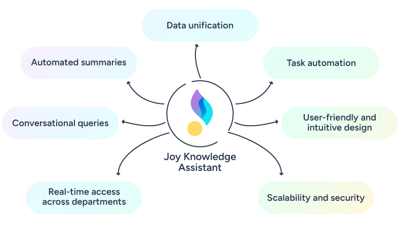 The JoySuite AI Knowledge Assistant is more than just a tool—it’s an ally for every department in your organization. By eliminating manual searches and repetitive tasks, our AI-powered knowledge suite lets your teams focus on what they do best: innovating, building relationships, and making high-impact decisions.